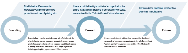 - Diversification based on a willingness to take on challenges cultivated since its establishment, underpinning its evolution from a manufacturer of printing inks to a chemicals manufacturer