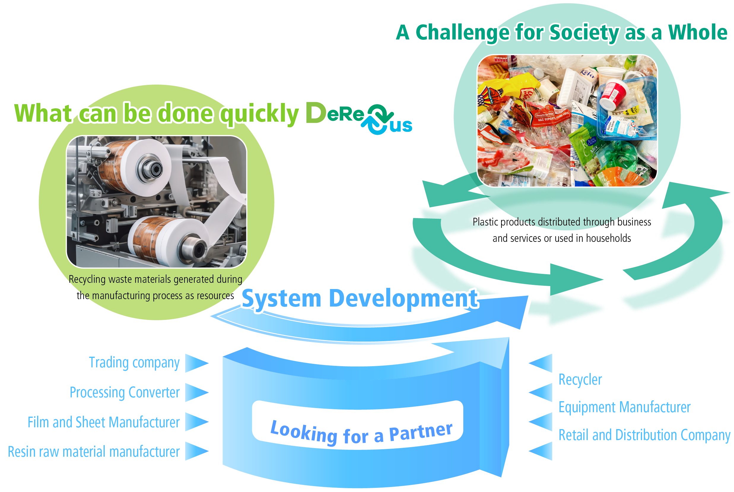 DIC will leverage DeReSus® technology to tackle what can be done quickly. To reduce waste plastic, we will first establish a system to recycle waste plastic before it enters the market.