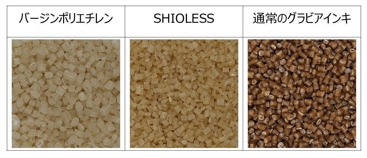 ■バージンポリエチレンペレットと、SHIOLESSまたは通常のグラビアインキを含むリサイクルペレット*2との比較写真