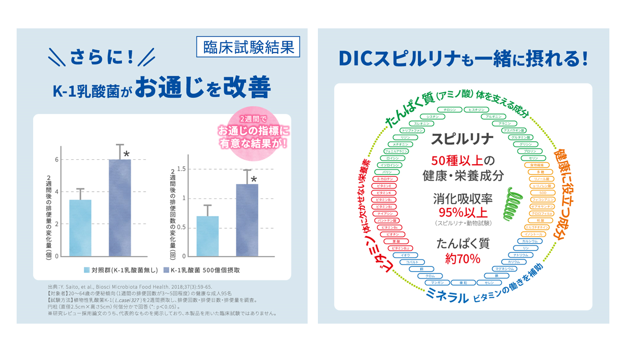 本製品は、睡眠・ストレス・お通じの3つの課題に着目し、タンパク質、ビタミン・ミネラルなど50種以上の健康・栄養成分を含む藍藻「DICスピルリナ」をベースに開発しました。睡眠の質の向上*1に役立つ機能および、仕事や家事などによる一時的な疲労感やストレス*2を和らげる機能をもつ「GABA」と、お通じを改善する機能をもつ「植物性乳酸菌K-1(L. casei 327)」を配合した、トリプルヘルスクレーム(3つの健康機能表示)の機能性表示食品です。健康の維持・増進に向けて、睡眠・ストレス・お通じの悩みをサポートするとともに、スピルリナに含まれる健康に重要な多くの栄養・健康成分も補給できます。