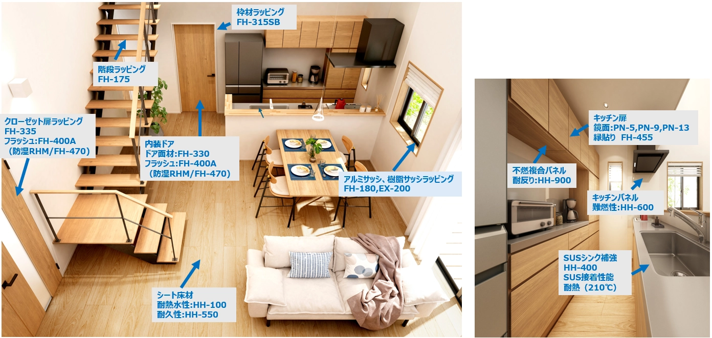 初期強度が必要なラッピング枠材、フラッシュパネル、練り合わせや、耐熱性が求められるシートフローリングや窓枠、非水系が求められる水廻り、床暖房パネル、不燃板、プラスティック複合部材など、幅広い建築部位に使用されています。
