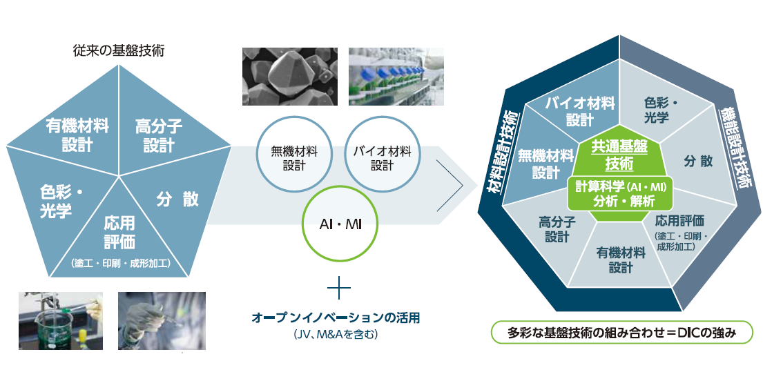 DICグループは、ブランドスローガン「Color & Comfort」のもと、サステナブルな社会への貢献を目指し、光学・色彩、有機分子設計、高分子設計、分散等の基盤技術と、合成、配合、表面処理などの各種要素技術を駆使した高付加価値製品の開発に取り組んでいます。グループ全体の技術リソースの融合により、また産官学連携やCVC活用などオープンイノベーションも積極的に活用し、持続的成長につながる次世代製品・新技術の開発を目指しています。