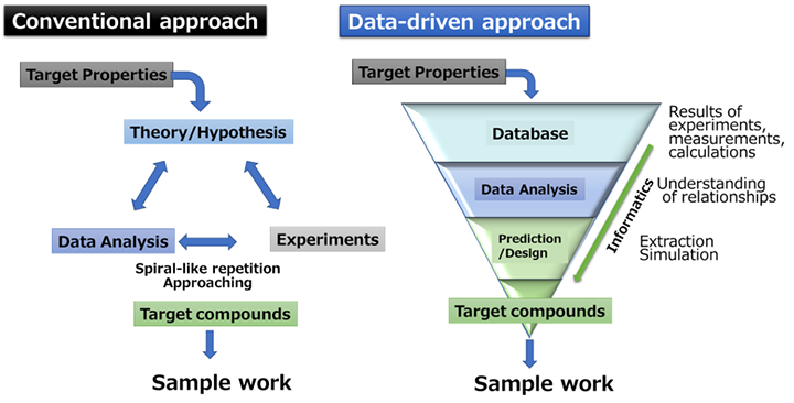 近年,科学分野における「第4のパラダイム」として,集約されたデータ(ビッグデータ)を起点に探究的アプローチをするデータ駆動型科学が注目されている1)。データ駆動型科学とは新たな機能を持った物質を専門的技術者が帰納的なPDCAサイクルで探索する従前の開発法に対して,データを起点にした情報科学(データサイエンス)的な統計・推論により演繹的に効率的且つ迅速探索を試みる開発アプローチである(Fig. 1)。DICに於いても,本年データサイエンスセンター(DSC)が創設され,データサイエンスを専門に取り扱う部署として技術の深耕と社内課題への展開を進めている。
