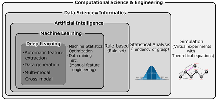 言語・画像処理や推論,課題解決,物質・システム設計などを人間に代わってコンピュータに行わせる技術を,一般的にAI(人工知能)やMI(マテリアルズインフォマティクス)と呼称し,それらは画像診断や無機化学の組成探索等に威力を発揮している2)。種々のご意見があることを承知ながら,混同されやすい技術分野の範囲をFig. 2に模式した。著者の理解ではデータサイエンスはデータ科学全般を表し,AIは個々で確立していない演算アルゴリズムを利用した技術全般を表現する。