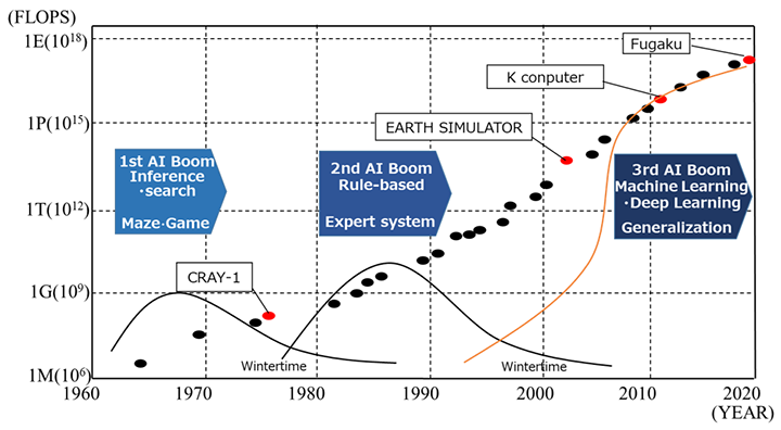 このAI/MIの発展はコンピューターの演算性能アップと無縁ではなく,データ演算による予測モデル構築に利用される識別や分類・回帰などの機械学習およびディープラーニングの発展はFig. 3に示すように演算速度と歩調を合わせるように栄枯盛衰を繰り返してきた。現在は第3次AIブームと呼ばれる波に乗っているかのように見受けられるが,ネットワーク化された高度情報化社会に引き波が訪れる様子は無く,今後もこの波は衰えることなく増幅すると予測される。