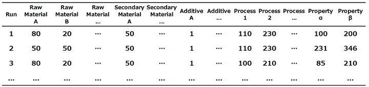 実際,著者らの手元に届く実験データはTable 1に示すような原料組成や配合組成と物性値が記された表が多く,そこに物性との相関性を検証するための分子構造情報等が記載されていることは稀である。まずは表記された数値の統計的な解析から着手するが,物性を説明するべき説明変数の表現力が不足する場面もあり,表現力を豊かにするために合成・分散・混錬・成形等のプロセスの情報の導入や,使用化合物の分子構造と物性の相関関係からの考察(QSPR)を検討する事例がほとんどを占める。