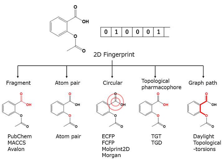 作成した構造式を前述のSMILESに変換し,フィンガープリント(分子指紋)と呼ばれるビットベクトル表現として構造の特徴を表すことが可能である。Fig. 5に代表的な2Dフィンガープリントを例示する。混合物,配合物などを表現する場合,ビットベクトルのモル比による幾何演算で表現可能であるため,構造的因子と物性の相関関係を探るうえで重要なテクニックだが,適切なビット表現を選択する必要があり,得られる情報の丁寧且つ繊細な取扱いが必須である。