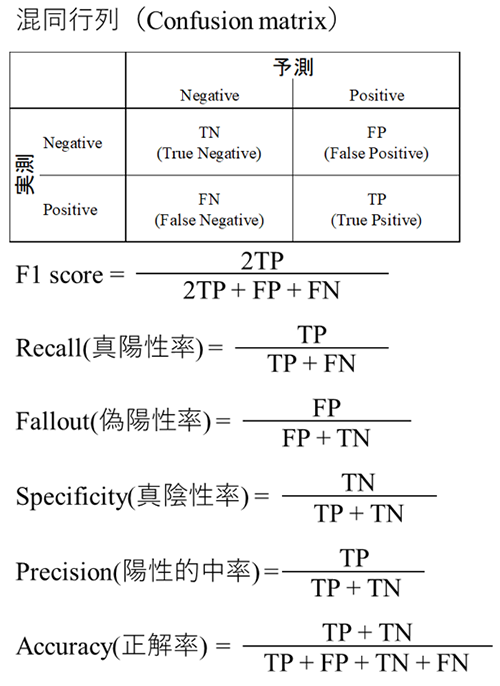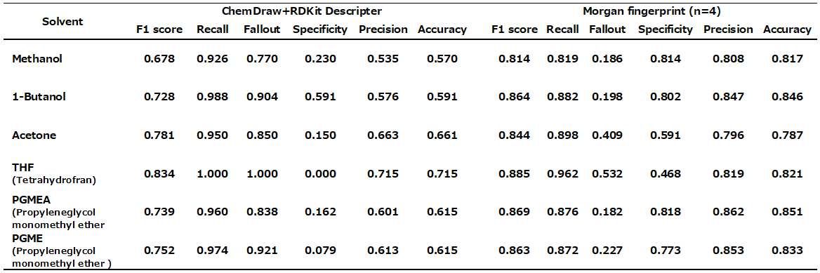 記述子およびフィンガープリントでフェノール化合物の代表的な各種溶剤への溶解性予測モデルを検討した結果をTable 4に示し,混同行列と各評価関数の算出式を下記する。