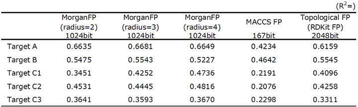 一般的に多価のフェノール系化合物は塩基性水溶液やメタノールなどのアルコール系溶剤,THFなどのエーテル系溶媒など,分子内に存在する水酸基と親和性の高い溶剤に良好な溶解性を有する。実際にはg/i線フォトレジストで使用されているm/p-クレゾールノボラックに塩基性水溶液難溶なものがあることは,当業者に周知の事実である。このように多価フェノール系化合物の検討では物性評価用サンプルの作成時に,固形サンプルの外観や分子構造のみで溶剤への可溶/難溶/不溶を見分けることが難しく,この段階での予測モデルを構築することは,効率的な物性評価とデータ蓄積を進めるために重要である。そこで,著者はフェノール系化合物の溶剤溶解性を分類予測するモデル構築を実施した。サンプル化合物の数値化はChemDrawとRDKitの記述子計算,およびRDKitで演算可能な数種のフィンガープリント化を実施した。種々の目標物性に対する,各種フィンガープリントで得られる回帰予測モデルの決定係数をTable 3に示す。