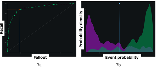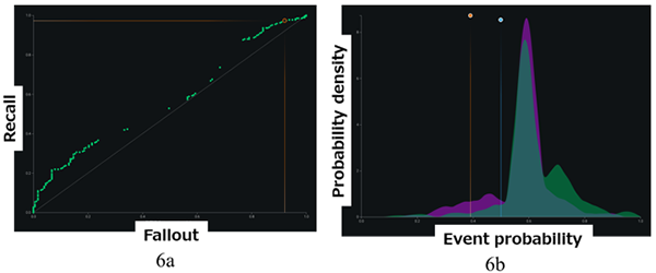 Fig. 6に記述子から構築した予測モデルのROC曲線と予測分布を示す。ROC(Receiver Operating Charac-teristic)曲線を簡単に説明すると,異常と正常を区別する閾値ごとに真陽性率(リコール)と偽陽性率(フォールアウト)を計算・プロットしたもので,閾値の変化に対する予測の切り分け具合を表す。