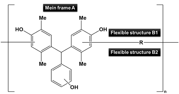 そこでモデルを単純化するために,ポリマーを原子団に分解するにとどめ 耐熱性と高アルカリ現像性を担保する主骨格A(Fig. 4aのノボラック),ポリマー主鎖に運動性の自由度をもたらす柔軟骨格B1,自由度を持つポリマー主鎖に柔軟性を付与する柔軟骨格B2の3ブロックに原子団化を行い,解析を進めることにした(Fig. 10)。ここで,柔軟骨格B1はポリマー主鎖に導入されるフェノール,クレゾール,キシレノール等からなるノボラック群,柔軟骨格B2は脂肪族鎖等の各種柔軟付与性が見込まれる置換基を表す31)。