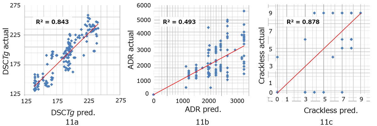 DSCTg,ADR,耐クラック性(50μm)の予測モデルの予実プロットをFig. 11に示す。