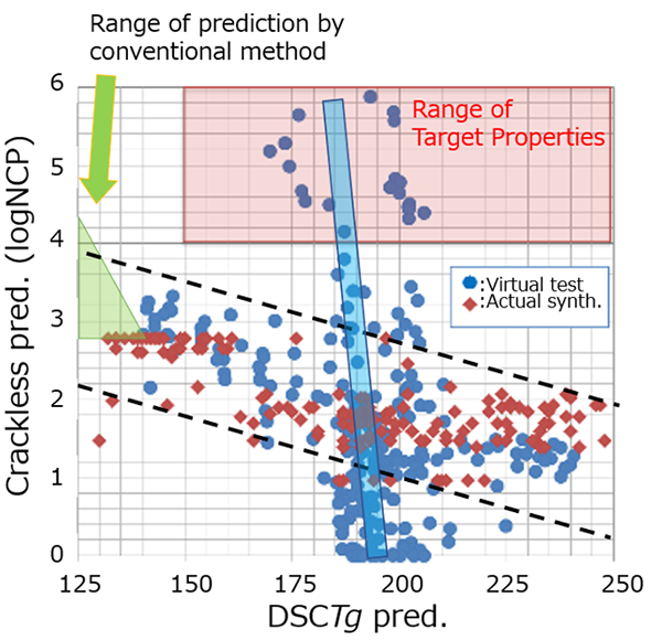 従来の合成プロセスに限定して予測される物性到達範囲はFig. 12の緑網掛範囲であり,実際の合成結果も黒破線で示される一定範囲を超えるものではなく,目標物性の範囲の達成には程遠いものであった。予測モデルにおいても同条件では同範囲に全て収まっており,予測モデルの妥当性が窺える。